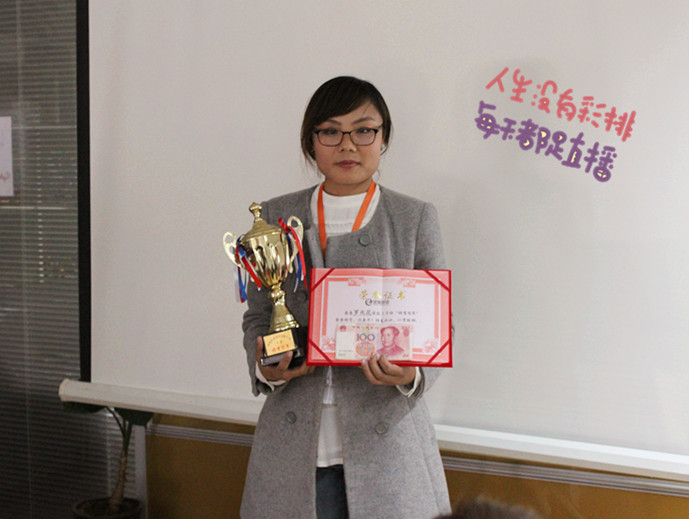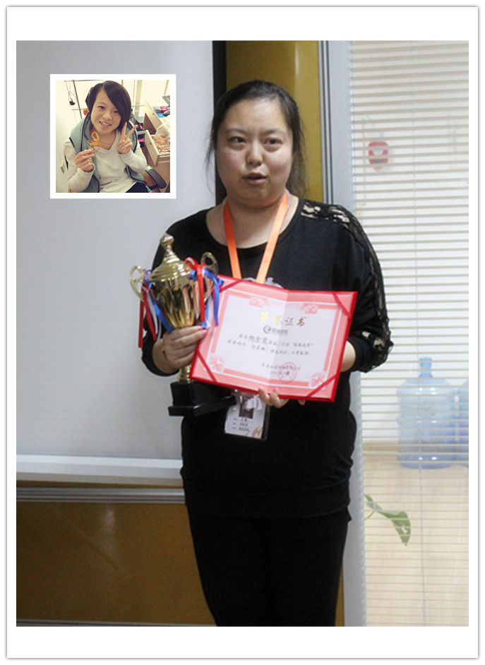 接下來(lái)是客服部冠軍獎,因為(wèi)金霞外出服務客戶了,由牟姐幫金霞領獎,沾沾冠軍的喜氣。