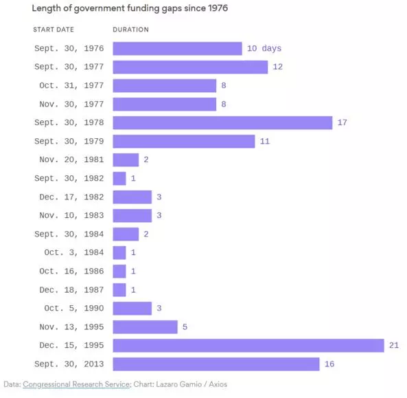 ▲1976年以來(lái)美國曆次政府關門(mén)時(shí)長