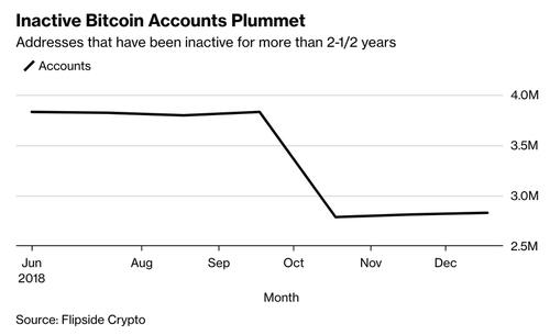 分析公司Flipside Crypto的數(shù)據顯示,從去年10月開(kāi)始,大(dà)量六個(gè)月到兩年半以上(shàng)沒有(yǒu)接觸比特币的持有(yǒu)人(rén)開(kāi)始轉移他們的比特币。這家(jiā)總部位于波士頓的公司發現,這一趨勢自新年伊始就持續了下來(lái),在過去30天裏一直活躍的賬戶如今占據了大(dà)約60%的流通(tōng)供應。