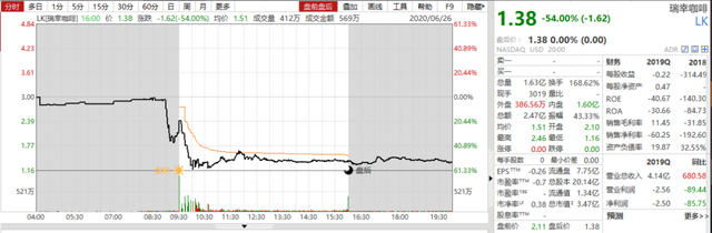 消息一出,開(kāi)盤後瑞幸暴跌,連續六次觸發熔斷,最大(dà)跌幅超60%。最終收盤價為(wèi)1.38美元/ADS,跌幅為(wèi)54%。