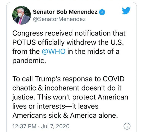 “國會(huì)收到通(tōng)知,美國總統在全球疫情大(dà)流行(xíng)期間(jiān),正式将美國從世衛組織中撤出。”美國國會(huì)參議院外交關系委員會(huì)成員羅伯特·梅嫩德斯7月7日則稱,特朗普在新冠疫情應對中表現出“混亂和(hé)前後不一”,退出世衛組織的舉動“不會(huì)保護美國人(rén)民的生(shēng)命或利益,而是使美國人(rén)生(shēng)病,使美國孤立無援”。