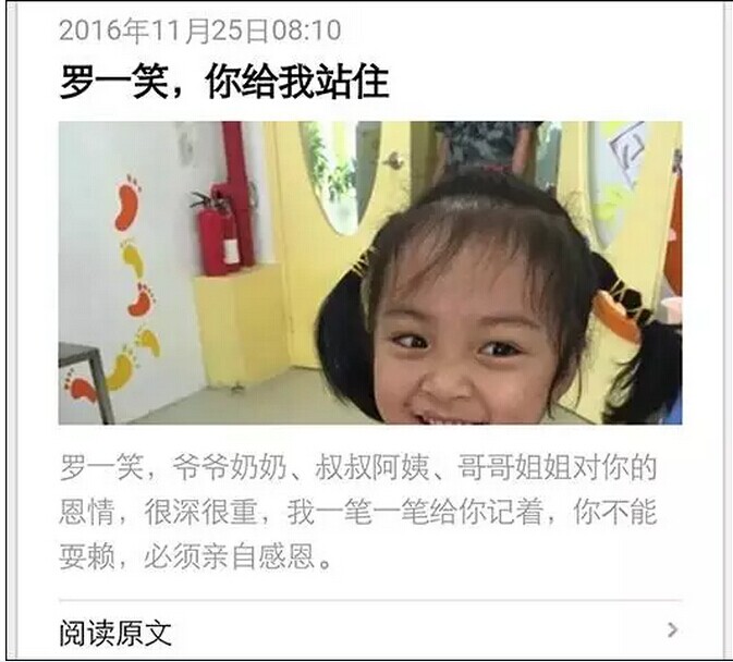 23 日,笑笑病危,住進重症監護室。每天上(shàng)萬的花(huā)費讓羅爾第一次感到了恐慌。經過反複思考,羅爾最終選擇了網絡籌款的方式。于是有(yǒu)了這篇名為(wèi)《羅一笑,你(nǐ)給我站(zhàn)住》的文章,開(kāi)始占據朋友(yǒu)圈。