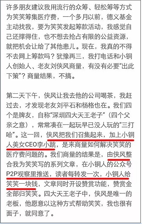 除了用這篇文章的打賞功能籌集醫(yī)療費,一家(jiā)名為(wèi)“小(xiǎo)銅人(rén)”的機構介入也助推此事變成朋友(yǒu)圈刷屏的熱點。