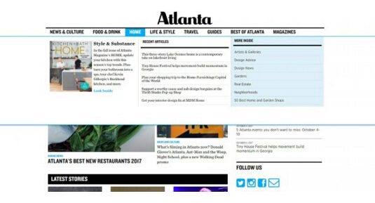 Atlanta Magazine 的大(dà)型導航菜單給人(rén)的體(tǐ)驗就非常流暢,下拉菜單中嵌入了大(dà)量的鏈接。由于響應式的滑動導航在移動端上(shàng)也已經很(hěn)常見了,這使得(de)它還(hái)輕松兼顧到了移動端的設計(jì)。