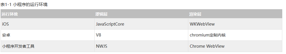 網頁開(kāi)發者需要面對的環境是各式各樣的浏覽器(qì),PC 端需要面對 IE、Chrome、QQ 浏覽器(qì)等,在移動端需要面對 Safari 、Chrome 以及 iOS、Android 系統中的各式 WebView 。而小(xiǎo)程序開(kāi)發過程中需要面對的是兩大(dà)操作(zuò)系統 iOS 和(hé) Android 的微信客戶端,以及用于輔助開(kāi)發的小(xiǎo)程序開(kāi)發者工具,小(xiǎo)程序中三大(dà)運行(xíng)環境也是有(yǒu)所區(qū)别的,如表1-1所示。